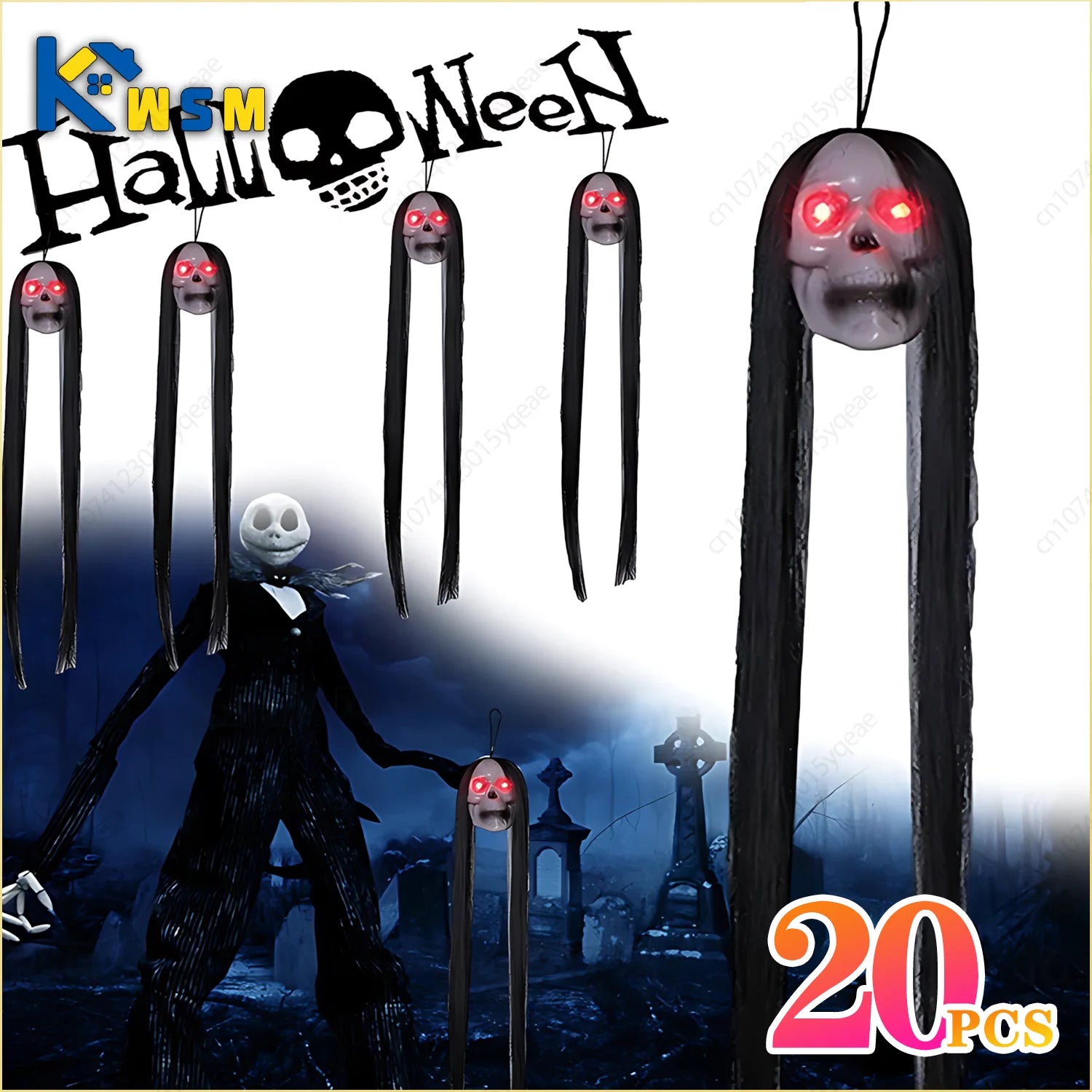 Halloween Hanging Ghost Skull with Long Hair Glowing Eyes Terror Skull Ghost House Head Skeleton Props 2024 Halloween Decoration