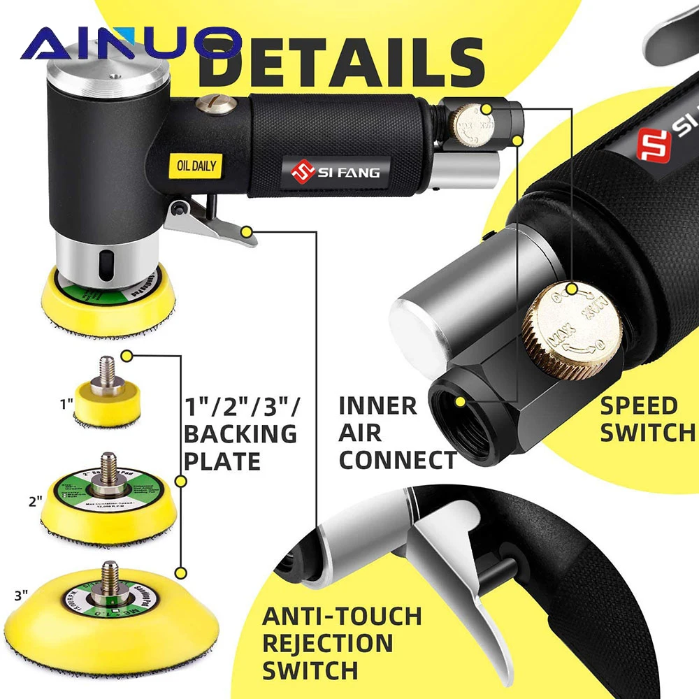High stability, low vibration rate and low energy consumption, 15000 Rpm. And it is easy to operate mini air sander. See more details in the product description or user manual