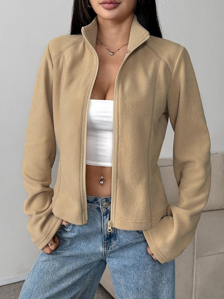 Women Fleece Jacket Top Autumn New Streetwear Fashion Long Sleeves Turn-Down Collar Zippers Coat Jacket Female's Sports Clothing
